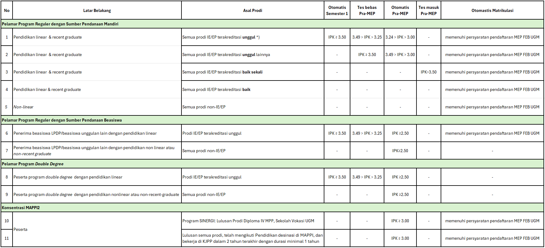 Diperuntukkan bagi pendaftar yang telah menempuh Program Matrikulasi/Pra MEP atau pendaftar dinyatakan bebas matrikulasi. Syarat pelamar dinyatakan bebas matrikulasi, apabila yang bersangkutan lulusan S1 dari jurusan ilmu ekonomi atau jurusan ekonomi pembangunan dengan syarat: